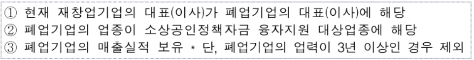 - 재창업 업력이 7년 미만인 소상공인(단, 아래의 요건을 모두 충족하는 소상공인)